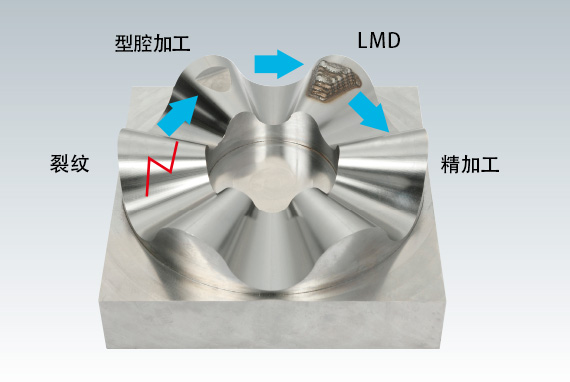 示例(3)樹(shù)脂模具的修補(bǔ)加工 ?一臺(tái)即可完成從去除裂紋到精密切削的全部加工 ?同時(shí)對(duì)應(yīng)難切削材料和高硬度材料 ![]() |