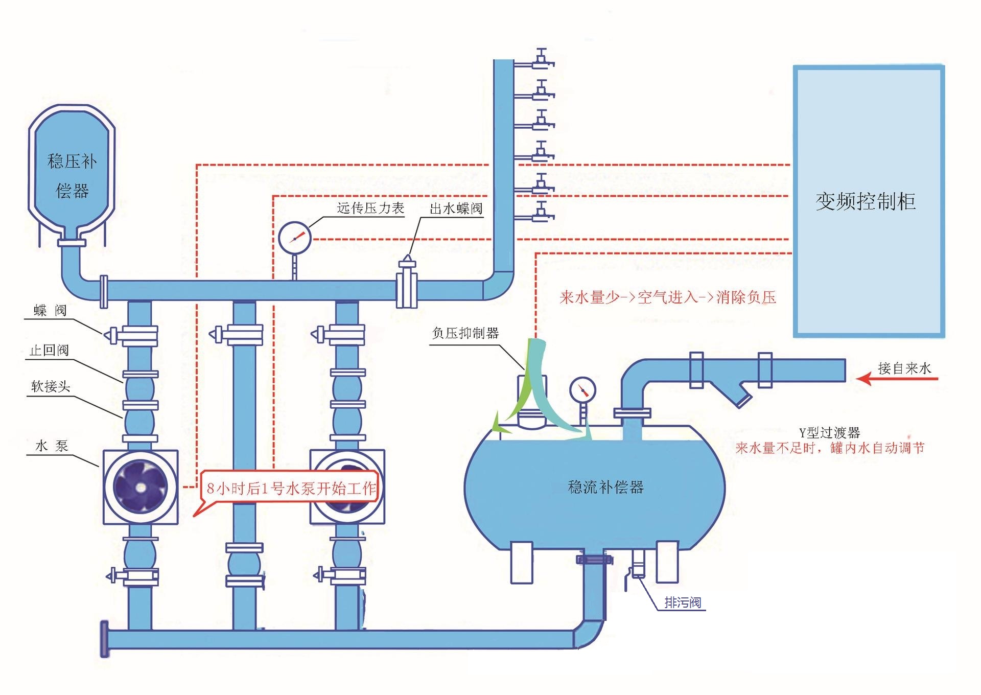 無負壓變頻供水設備投入使用,自來水管網的水進入穩流流罐,罐內空氣從真空消除器排出,待水充滿后,真空消除器自動關閉。當自來水管網壓力能夠滿足用水要求時,系統由旁通止回閥向用水管網直接供水;當自來水管網壓力不能滿足用水要求時,系統壓力信號由遠傳壓力表反饋給變頻控制器,水泵運行,并根據用水量的大小自動調節轉速恒壓供水,若運轉水泵達到工頻轉速時,則啟動另一臺水泵變頻運轉。水泵供水時,若自來水管網的水量大于水泵流量,系統保持正常供水:用水高峰時,若自來水管網水量小于小泵流量量,穩流罐內的水作為補充水源仍然能正常供水,此時,空氣由真空消除器進入穩流罐,罐內真空遭到破壞,確保了自來水管網不產生負壓,用水高峰過后,系統又恢復到正常供水狀態。當自來水管網停水,造成穩流罐液位不斷下降,液位探測器將信號反饋給變頻控制器,水泵自動停機,以保護水泵機組。夜間小流量供水且自來水管網壓力不能滿足要求時,氣壓罐可以貯存并釋放能量,避免了水泵頻繁啟動